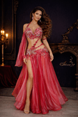 Romantic custom set for professional belly dancers. Costume features a long two layer skirt of the strawberry pink and cream fabric united with the bra with the crossbody strap. Bra and the belt are embellished with a high quality bead embroidery and cascades of rhinestone chains. One sleeve element makes our hand painted set with asymmetric design more outstanding and attractive.
