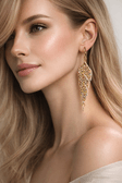 Elegant leaf-shaped drop earrings embellished with shimmering champagne crystals and gold-tone details. Lightweight and sparkling in motion, they add a refined stage glow — perfect for ballroom, Latin dance, competitions, and photoshoots.
